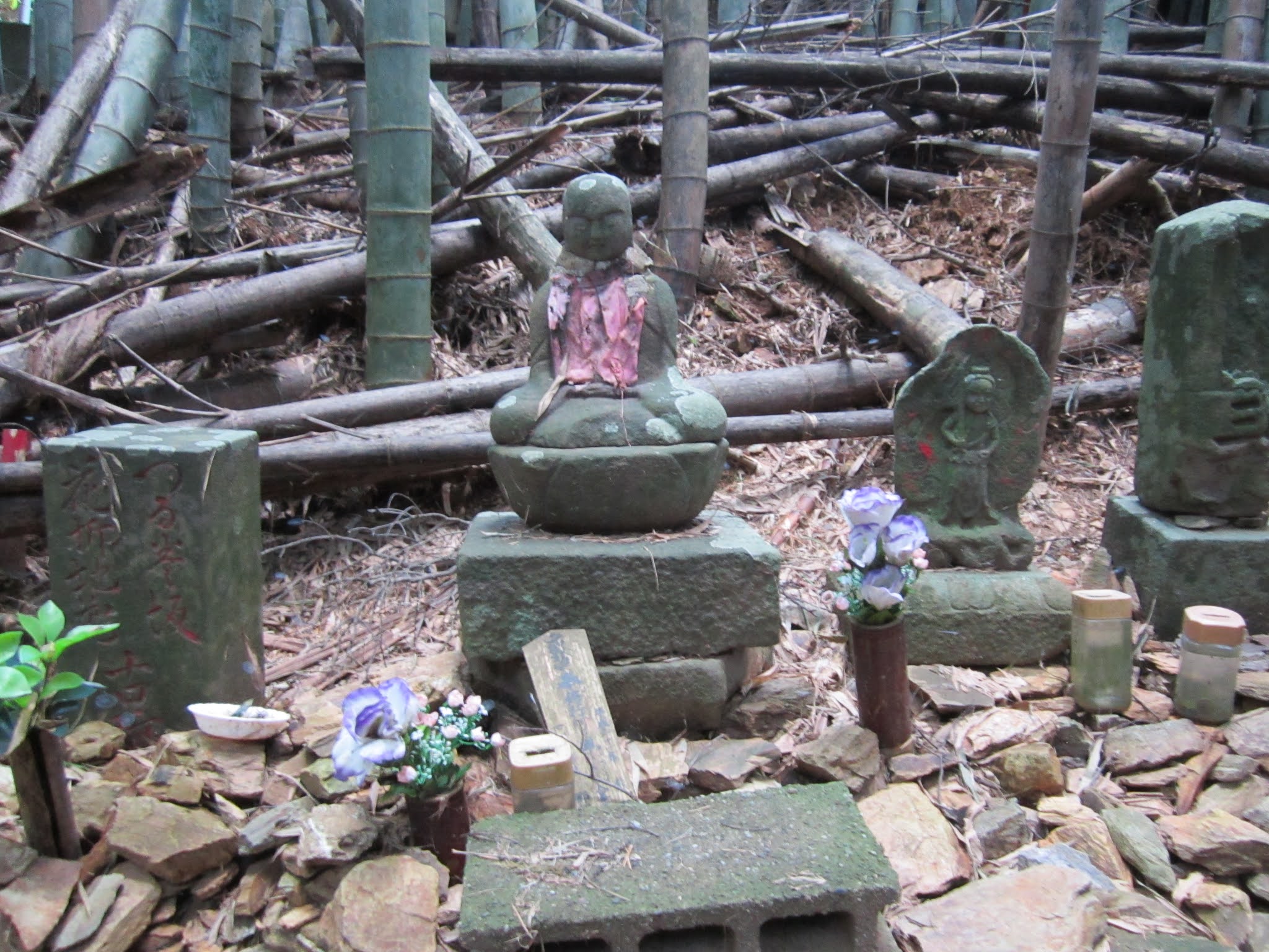 釈迦庵を見学し、仏に手を合わせながら、無慈悲な殺生を思わずしてしまい、心が痛む。藪に囲まれ、丈高い雑草も生い茂るなか、蜘蛛の巣を払いながら、あちらこちらを見た。その時、首筋に違和感を感じたので手で払うと、大きな女郎蜘蛛が私の手から細い糸でぶら下がっている、ヒェ~といいながら思わず振り払い足で踏んでしまった。殺生禁断の境内でひどいことをしたと悔やまれる。